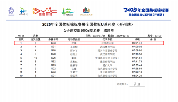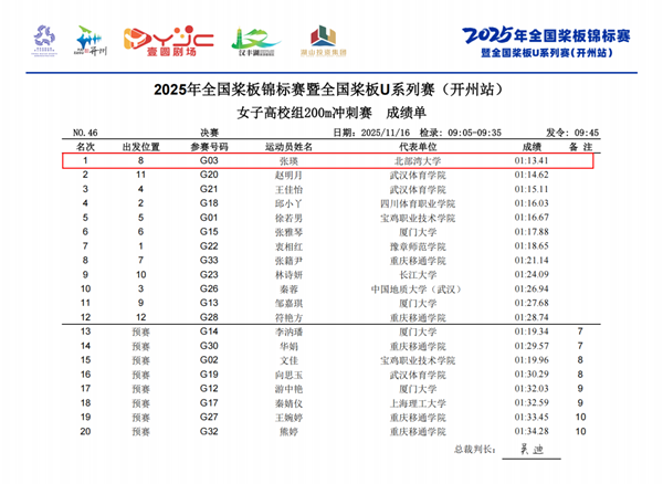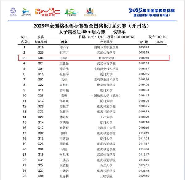 11月15日至16日,2025年全国桨板锦标赛暨全国桨板U系列赛(开州站)在重庆开州汉丰湖举行。本次赛事为国内桨板运动最高级别比赛,共吸引来自全国20个省市的93支队伍、1236名选手参赛。beat365官网桨板队表现出色,体育学院体教本231班学生张瑛从来自全国高校的一众强手中脱颖而出,在高校组女子项目中勇夺双冠,实现了历史性突破。
