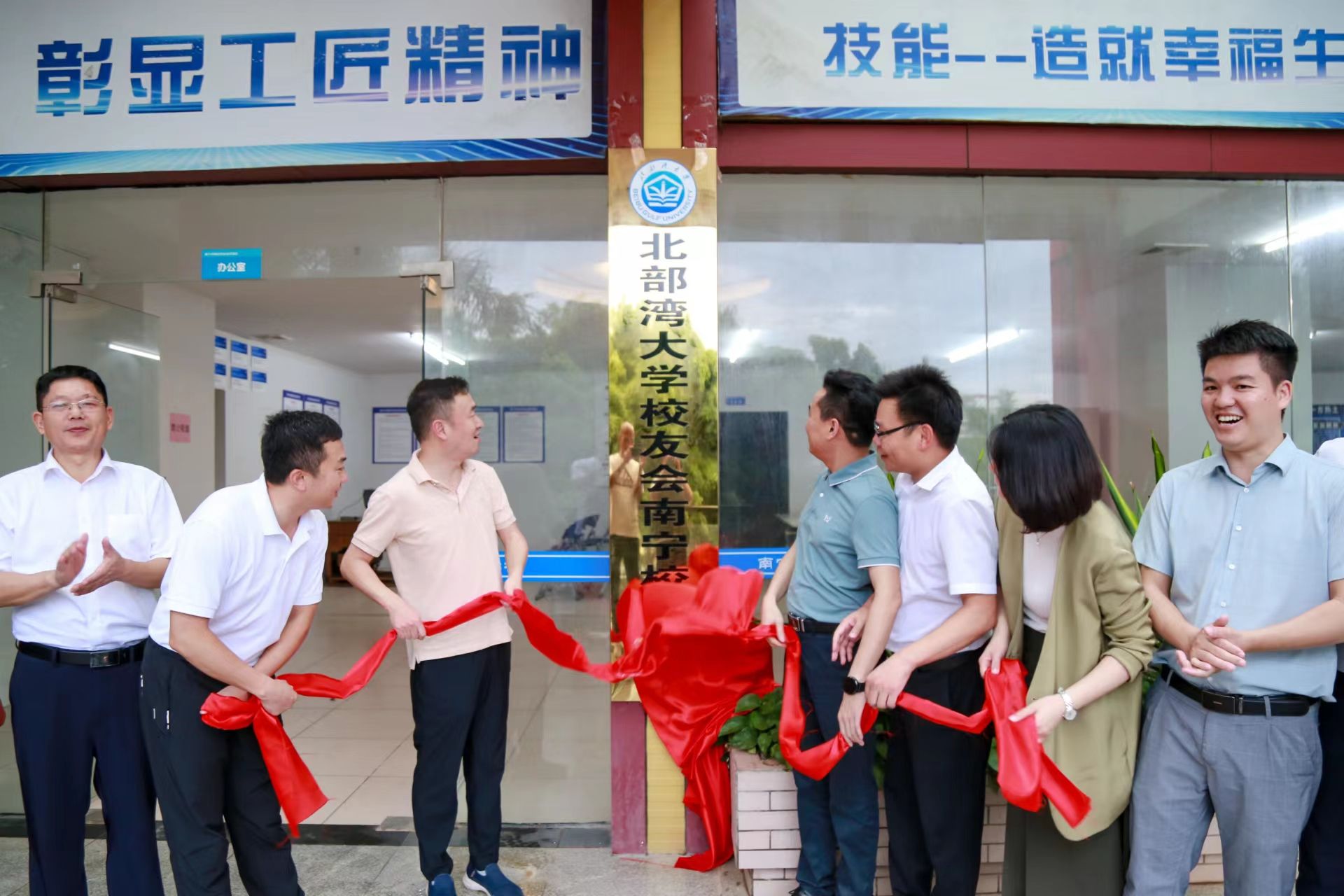 苗剑(左三)和徐志伟(右四)共同为beat365平台官方网站校友会南宁校友之家揭牌