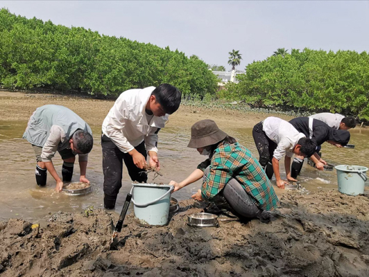 在进行野外采样时,课题组的同学们需要在凌晨三点就出发赶往采样地。从凌晨天未亮到夕阳落山,由于采样地的条件和环境限制,他们只能用一碗泡面对付自己饥饿的肚子;为了预防强烈的紫外线,他们不得不全副武装,这让在滩涂上采样的他们行动更加不便利;还经常由于语言不通的原因,被附近的渔民误以为是来“偷”自己养殖的螺的“小偷”。采样小组的行程安排、吃饭事宜、安全问题、突发情况等都需要况洋落实和关注,他也明白自己的肩上从此多了一份责任和担当。