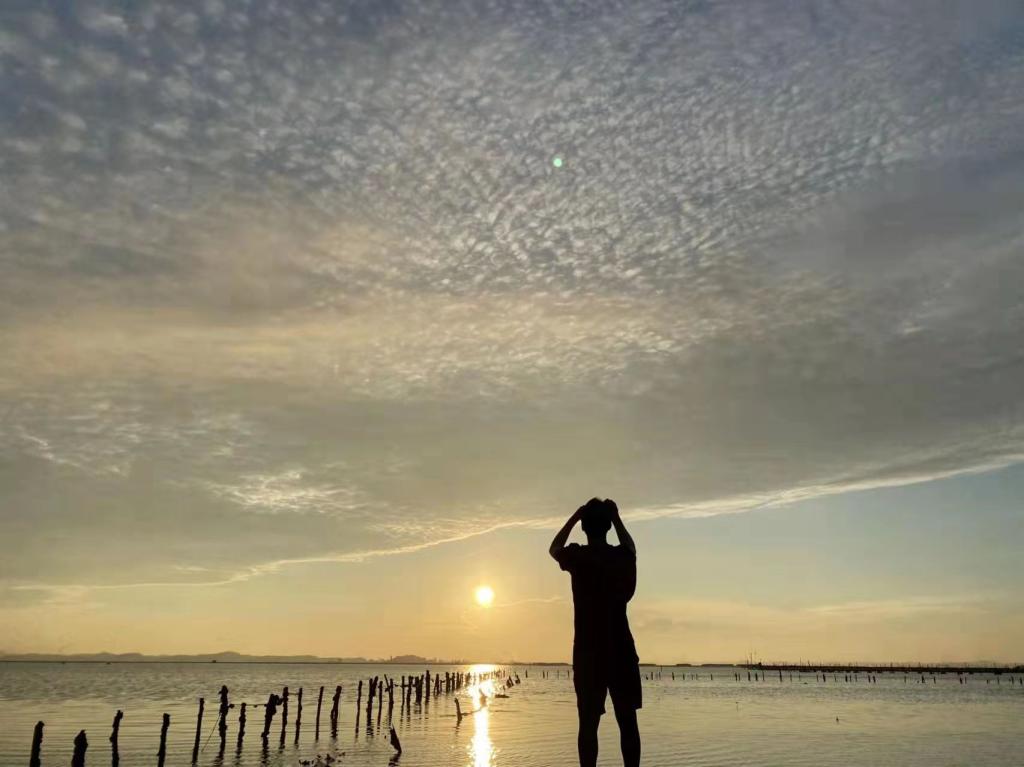 采样时,况洋在海滩上与日出留下了合影