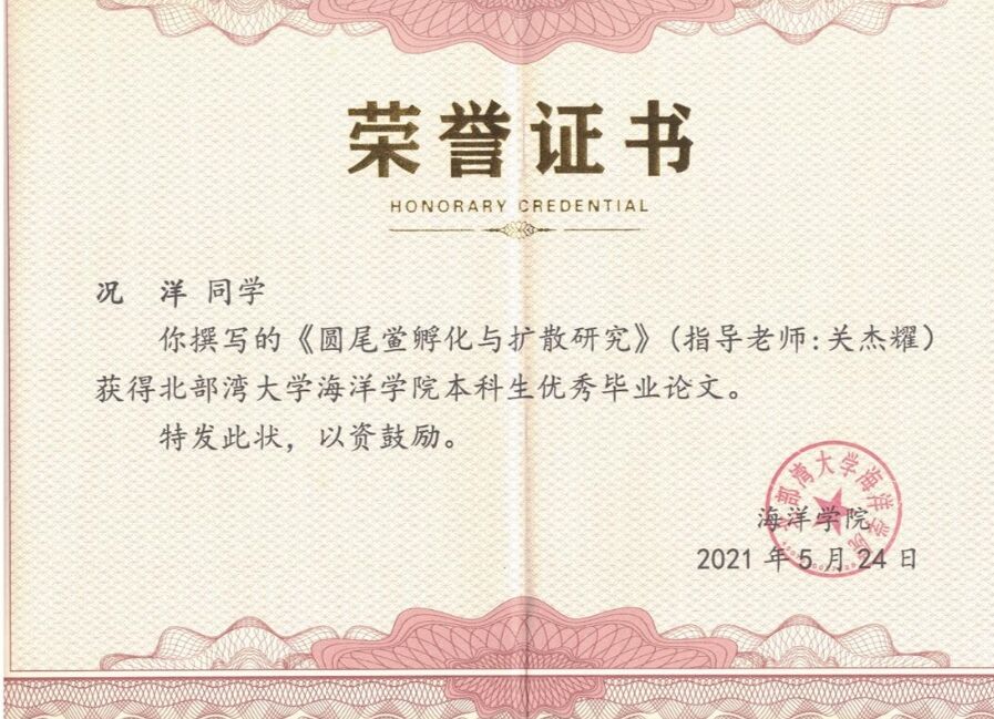 最终,鲎孵化发育机制研究成果于2022年4月在中科院大类2区外文期刊《中国海洋大学学报》(Journal of Ocean University of China)发表。况洋和陈健安为共同第一作者,关杰耀为通讯作者。谈到自己的研究成果发表在核心期刊上时,况洋高兴地说:“这对我来说无疑是巨大的收获,是我本科期间对科研不断探索而获得的胜利果实,同时更加坚定了我在海洋科研这条路上走下去的决心。”