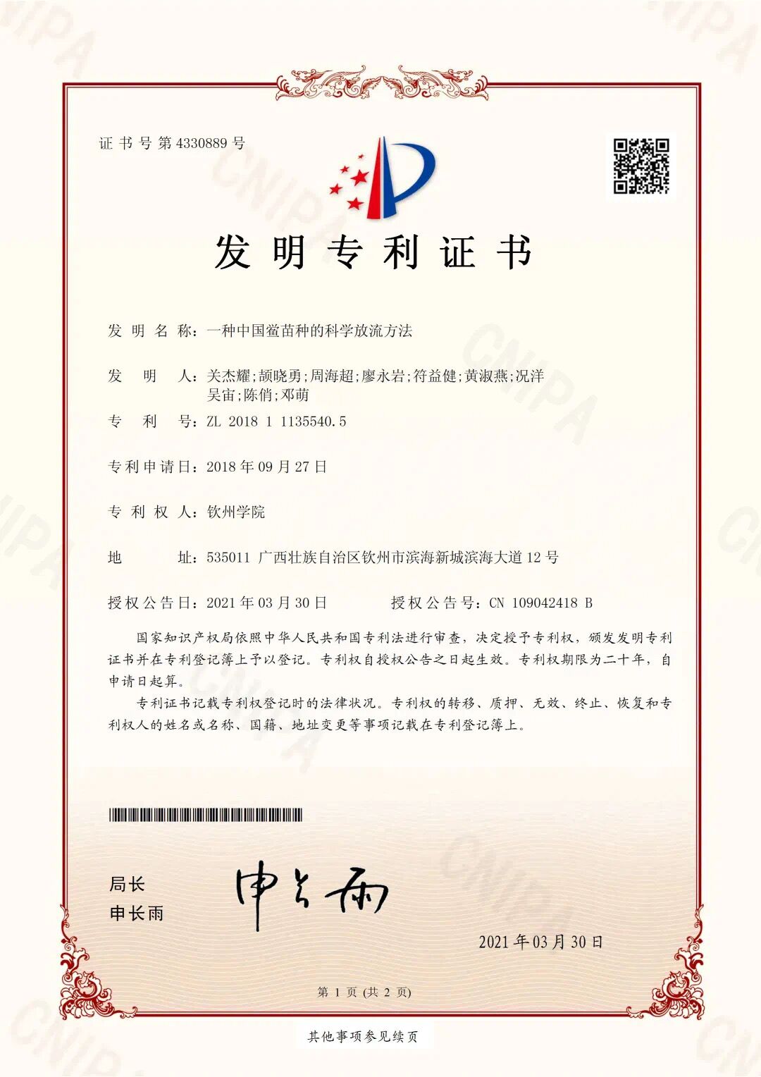 一种中国鲎苗的科学流放方法获得一项专利发明证书