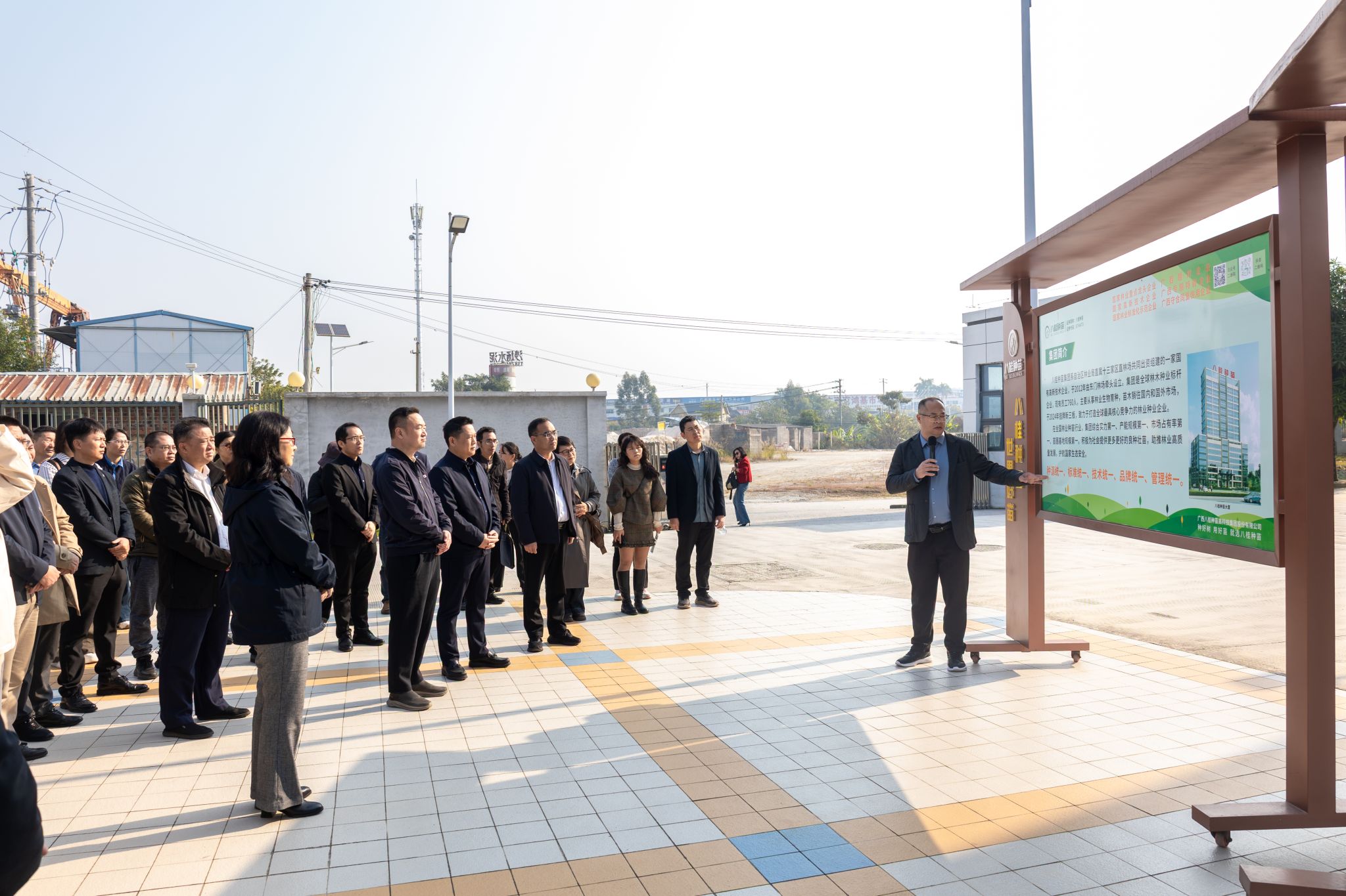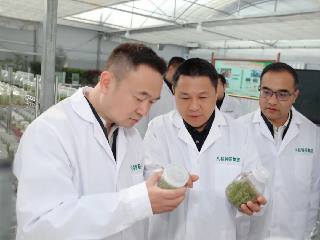 在广西八桂种苗高科技集团科教组培厂炼苗大棚,该集团董事长叶家义(左二)向beat365官网党委常委、校长苗剑(左一)介绍组培瓶苗